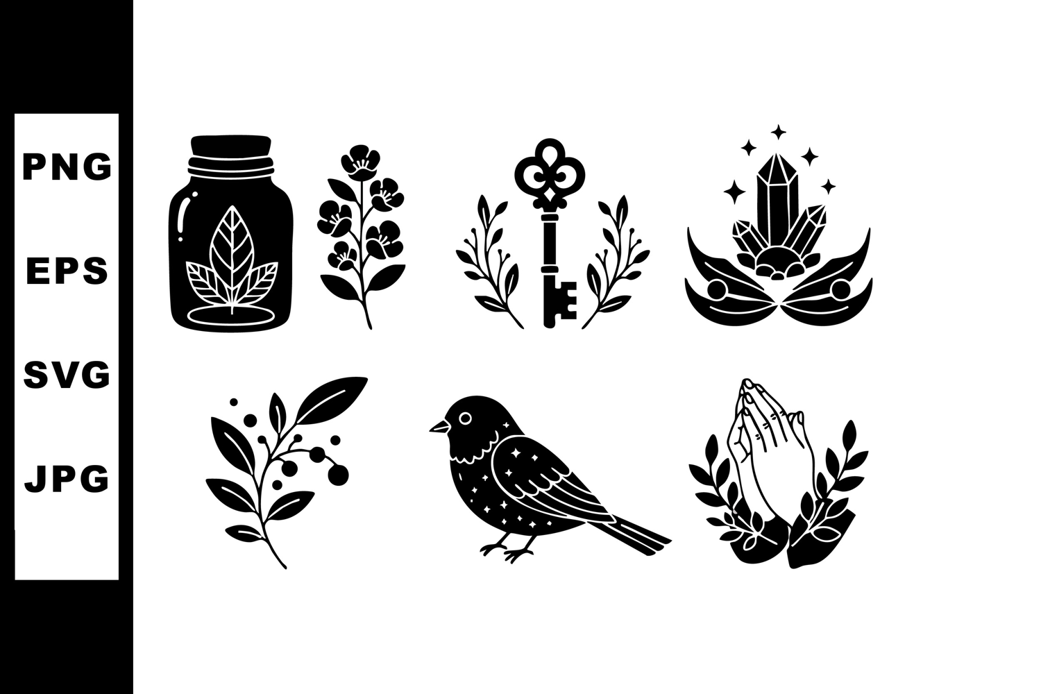 Herbal icons including bird, key, crystal, jar, and praying example image 1
