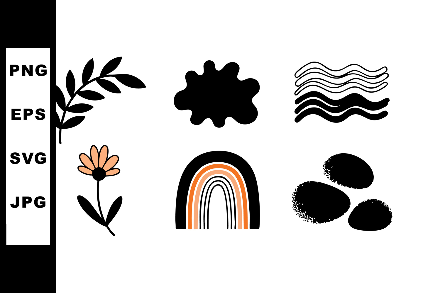 Vector set includes minimalist black and orange botanical leaves, flower, rainbow, and abstract shapes in a clean style. Calm mood.