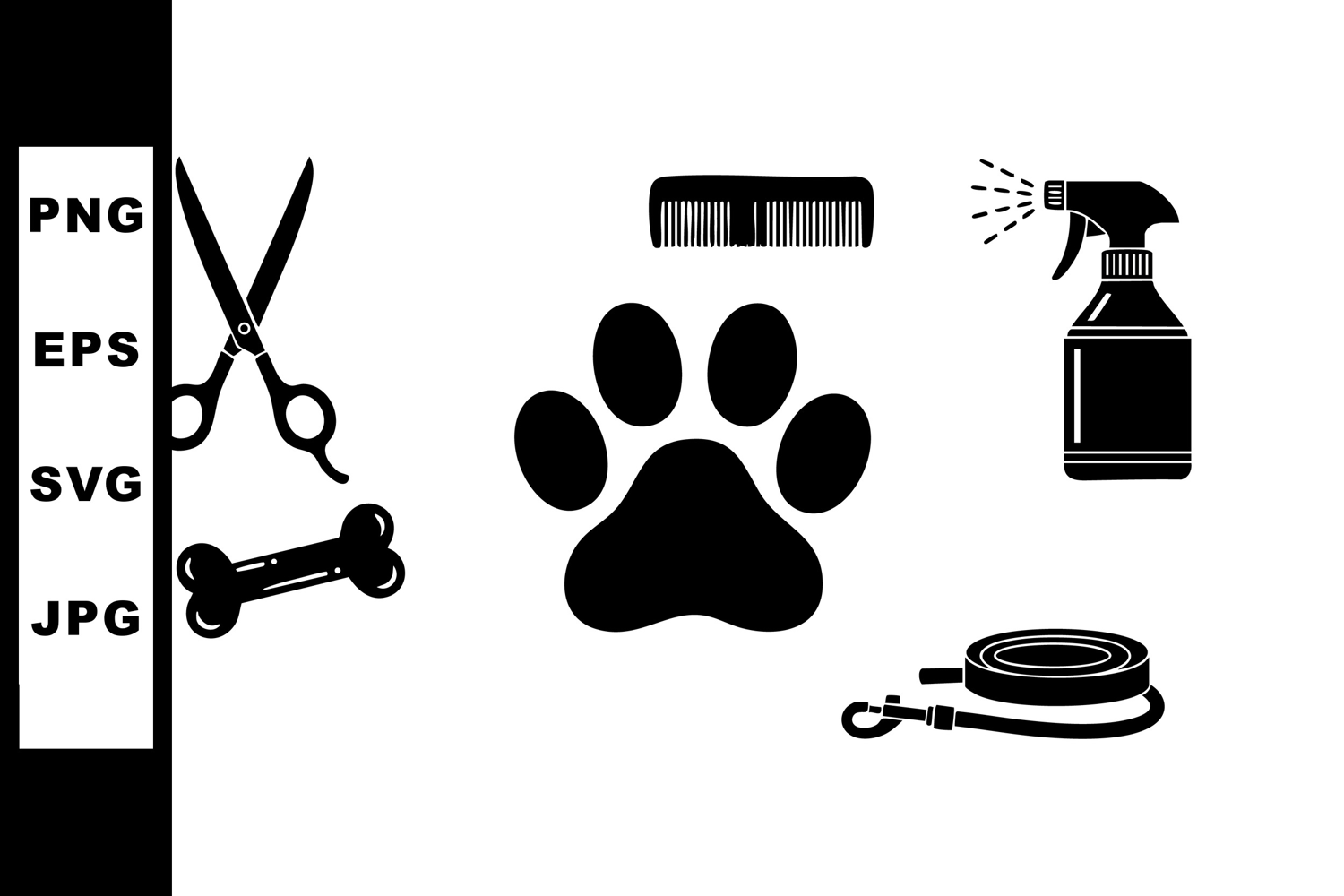 Vector icons show pet grooming tools including scissors, comb, spray bottle, paw print, bone, and leash in black silhouette style. Clean and minimal mood.