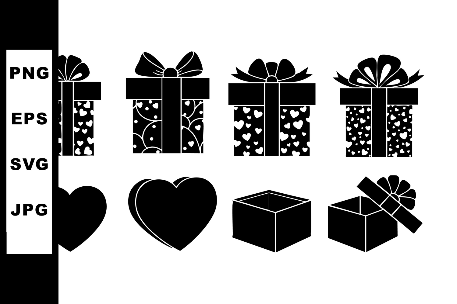 This vector file features black silhouette gift boxes with bows and heart shapes ideal for celebration themes. It presents a minimalistic and elegant design suitable for festive moods.