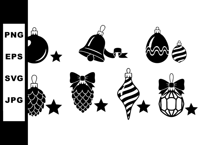 This vector file shows a collection of Christmas tree ornaments including baubles, bells, ribbons, bows, pine cones, and stars in black silhouette style, festive and elegant.