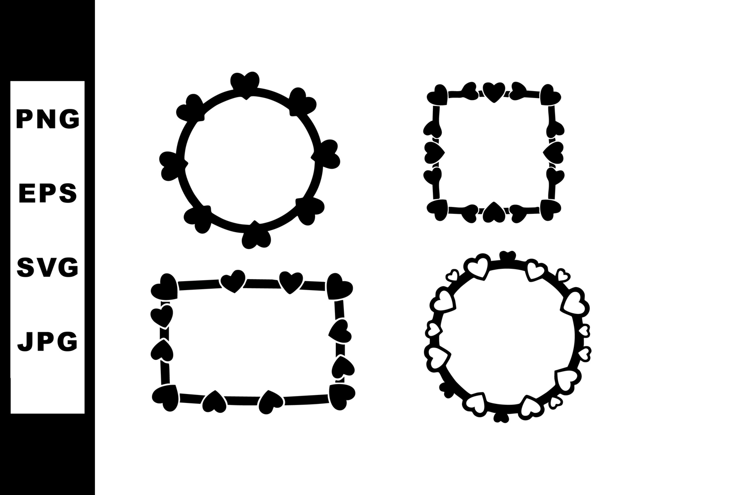 This vector file shows four heart-shaped decorative frame borders in black and white suitable for romantic and love-themed designs, creating a charming and elegant mood.