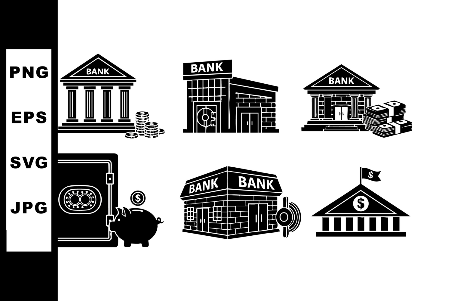 This vector set features classic and modern bank buildings, a piggy bank, safe, and money symbols representing financial and banking concepts in black silhouette style. Clear and professional mood.