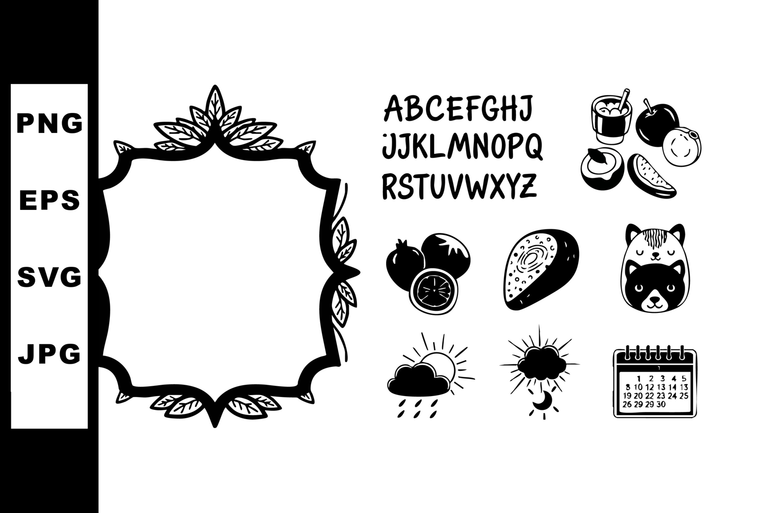 Vector illustration features ornate frame, uppercase alphabet, food items, animal face, sun icons, and calendar in black and white style. Creative and simple mood.