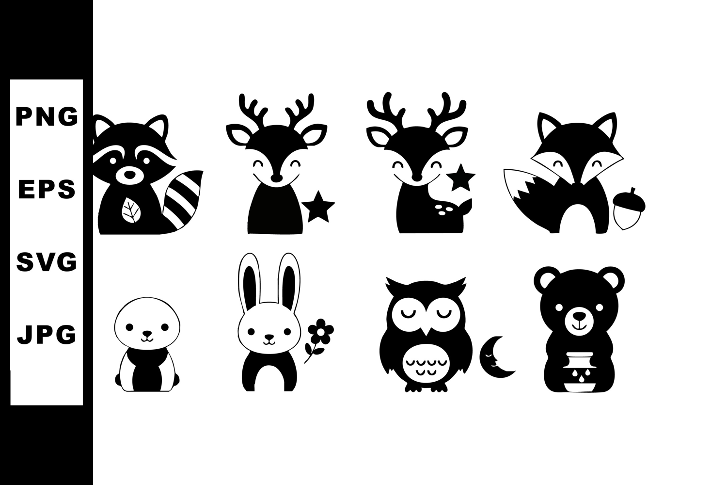 This vector features black and white woodland animals including raccoon, deer, fox, owl, and more in simple silhouettes. Charming and playful mood.