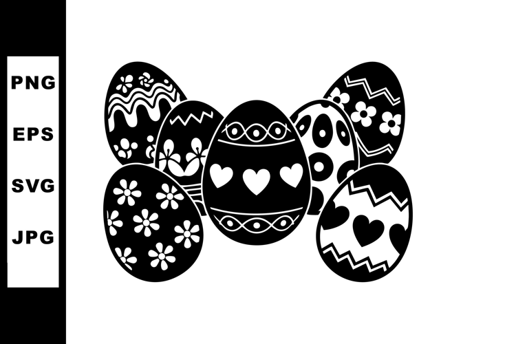 Six Easter eggs display various floral, heart, and geometric designs in black and white, arranged closely in a festive composition. Cheerful mood.