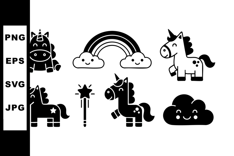 This vector set features black silhouette unicorns, a smiling cloud, a rainbow, and a magic wand in a playful style, creating a joyful mood.
