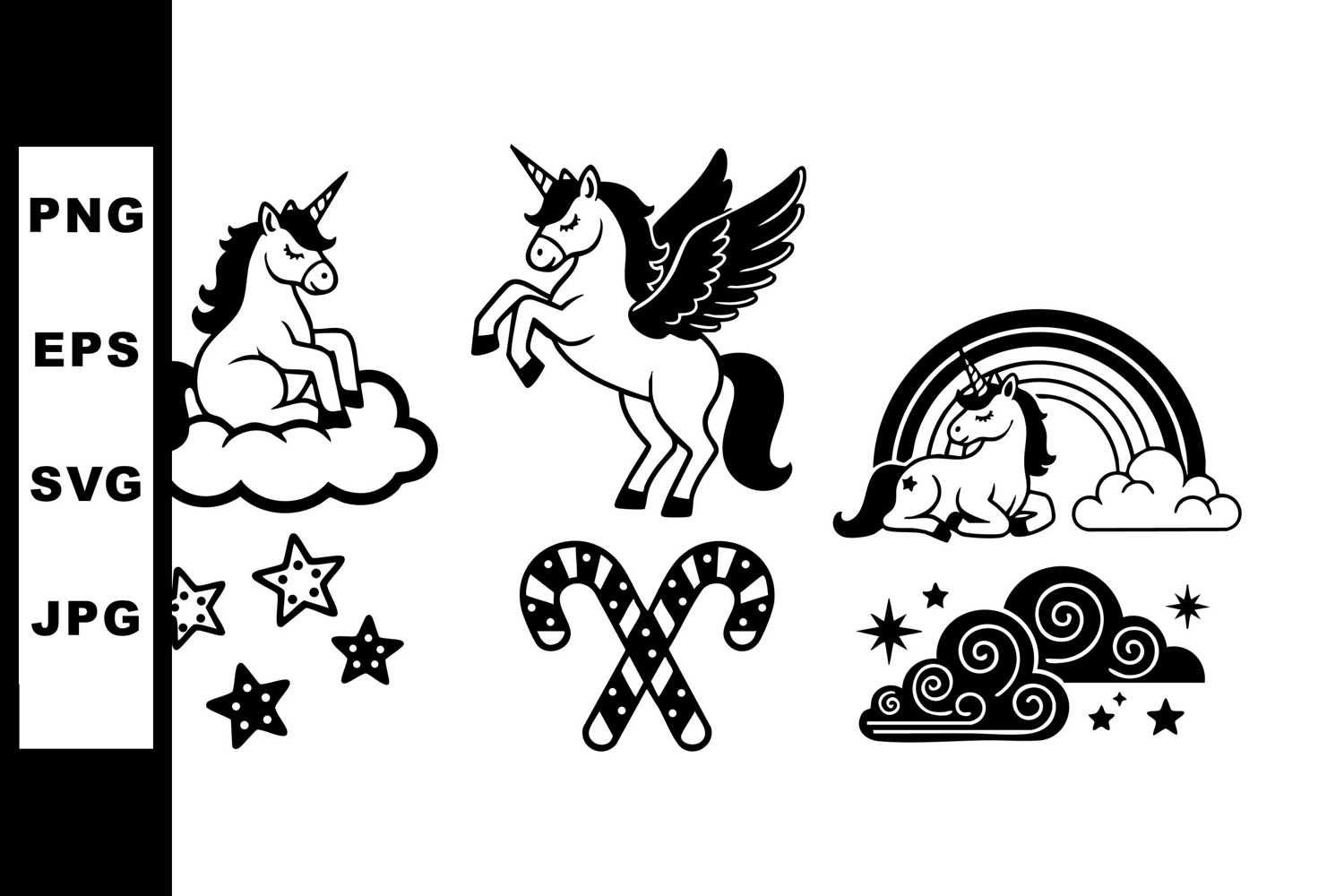 Unicorns with clouds stars candy canes and rainbow vector il example image 1