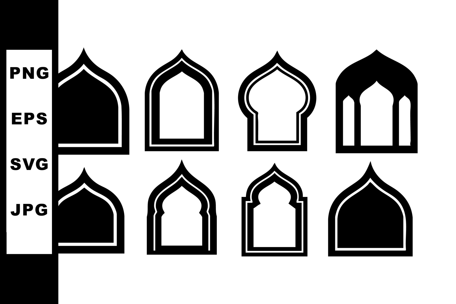 This vector file shows eight Islamic arch window shapes in black and white, featuring simple geometric designs suitable for architectural and decorative purposes. Minimalist and elegant.