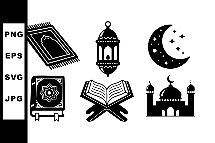 This vector set features iconic Islamic religious symbols including a mosque, lantern, crescent moon, prayer rug, and Quran book, presented in a simple black silhouette style, spiritual mood.