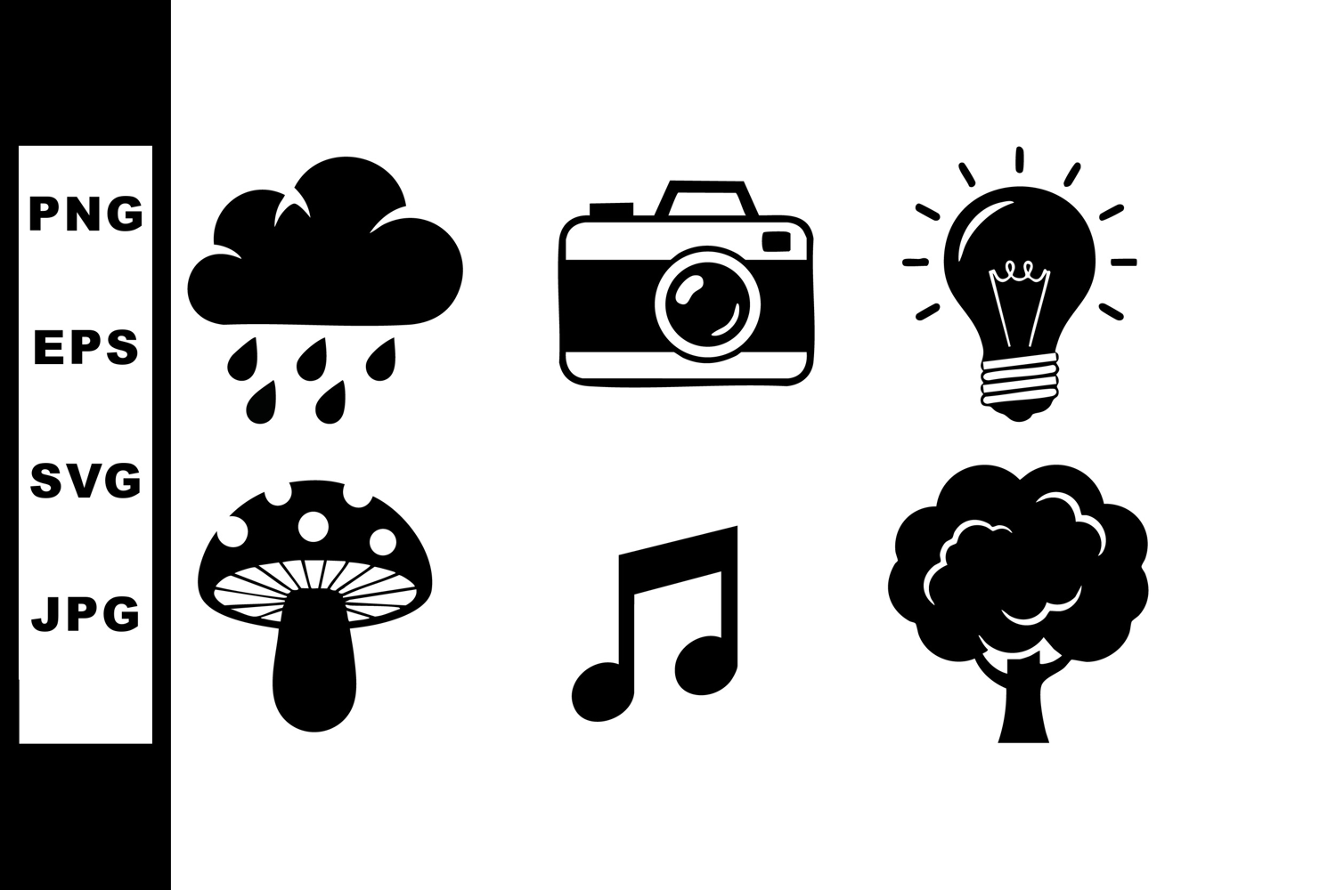 Black silhouette icons of rain cloud, camera, light bulb, mu example image 1