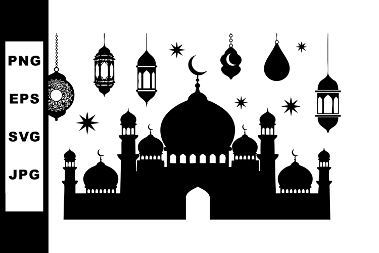 Islamic mosque silhouette with hanging lanterns crescent sta example image 1