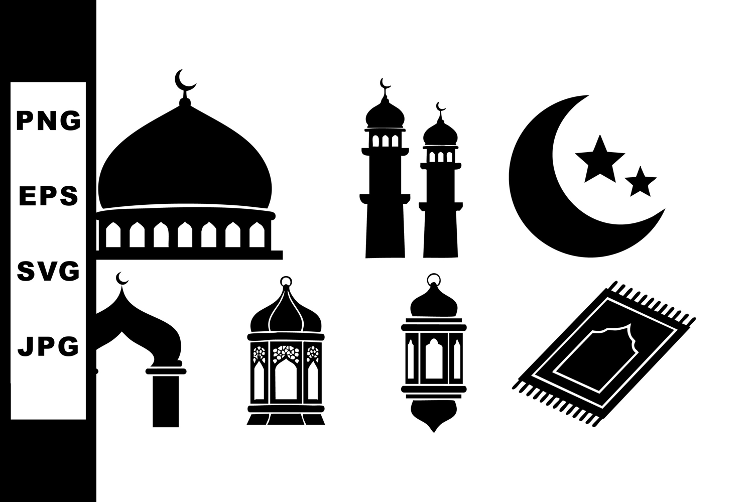 Vector set of Islamic religious symbols including mosque domes, minarets, crescent with stars, lanterns, and prayer rug in black silhouette style, representing faith and tradition. Calm and respectful.