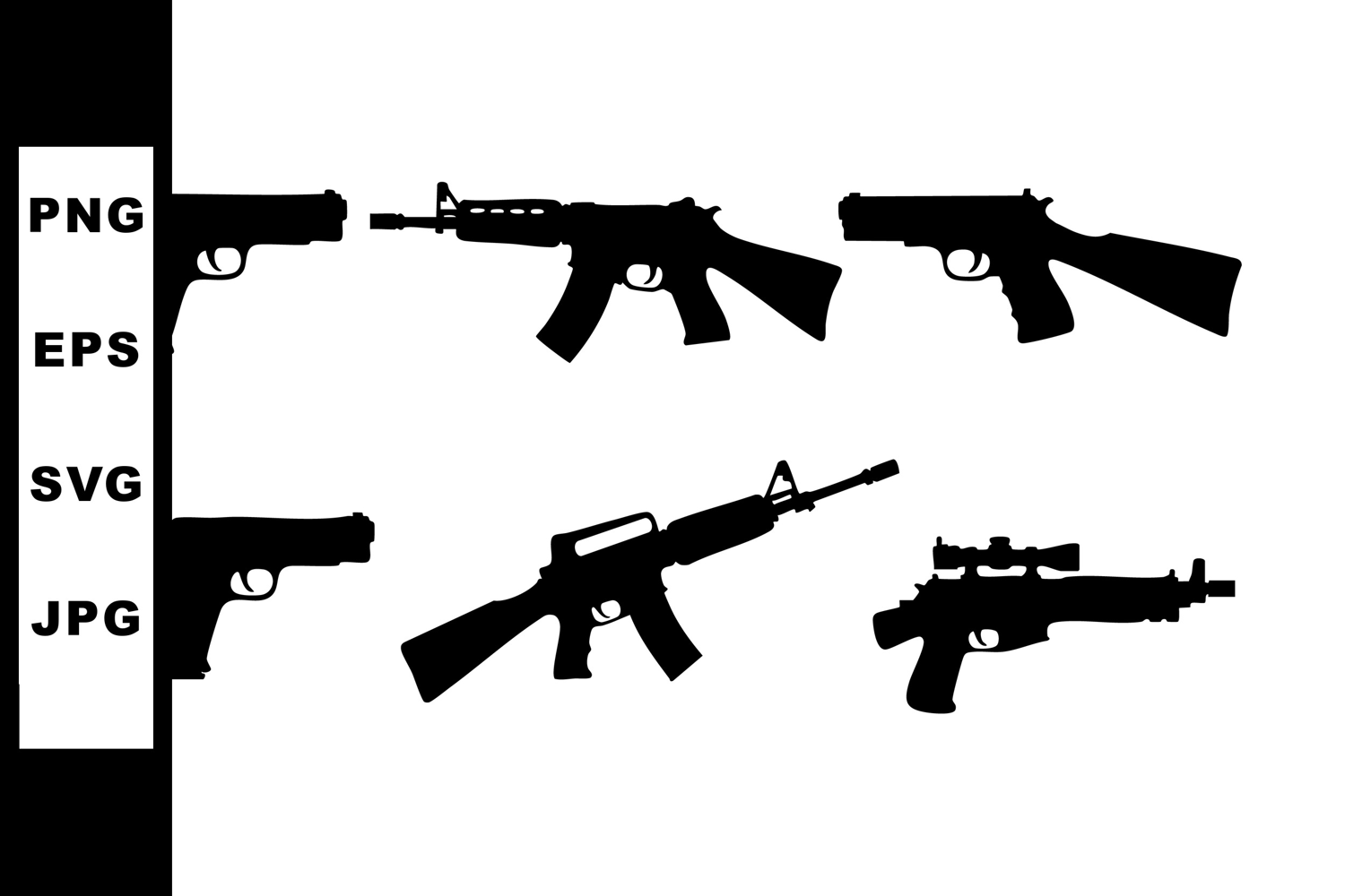 This vector shows a collection of black gun silhouettes including pistols and rifles on a white background, simple and bold composition, neutral mood.