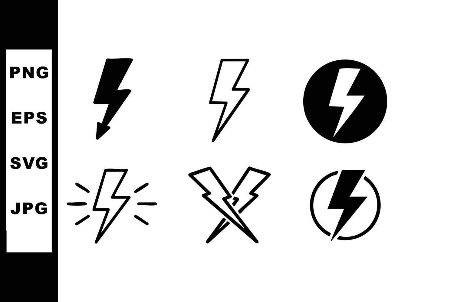 This vector image shows six electric lightning bolt icons in different solid and outline styles with black color. Energetic and dynamic design.