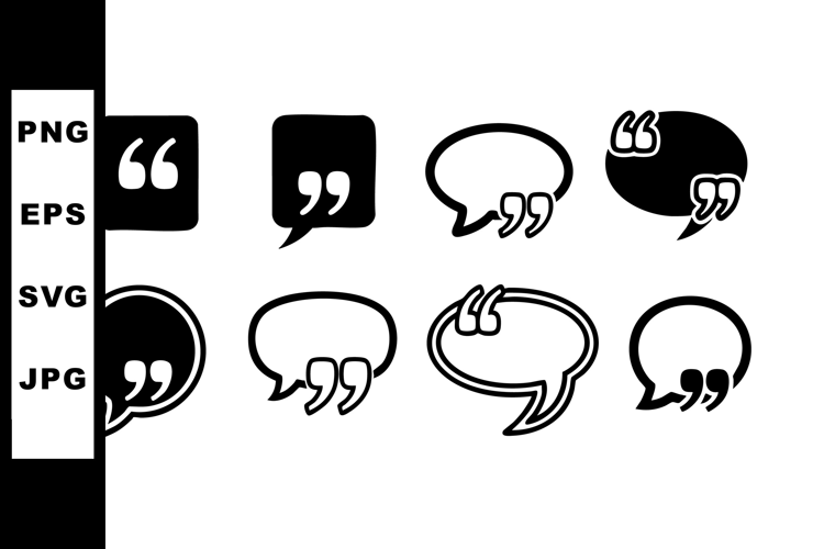Vector illustration shows eight black and white speech bubble icons with quotation marks in simple style. Clean and minimal mood.