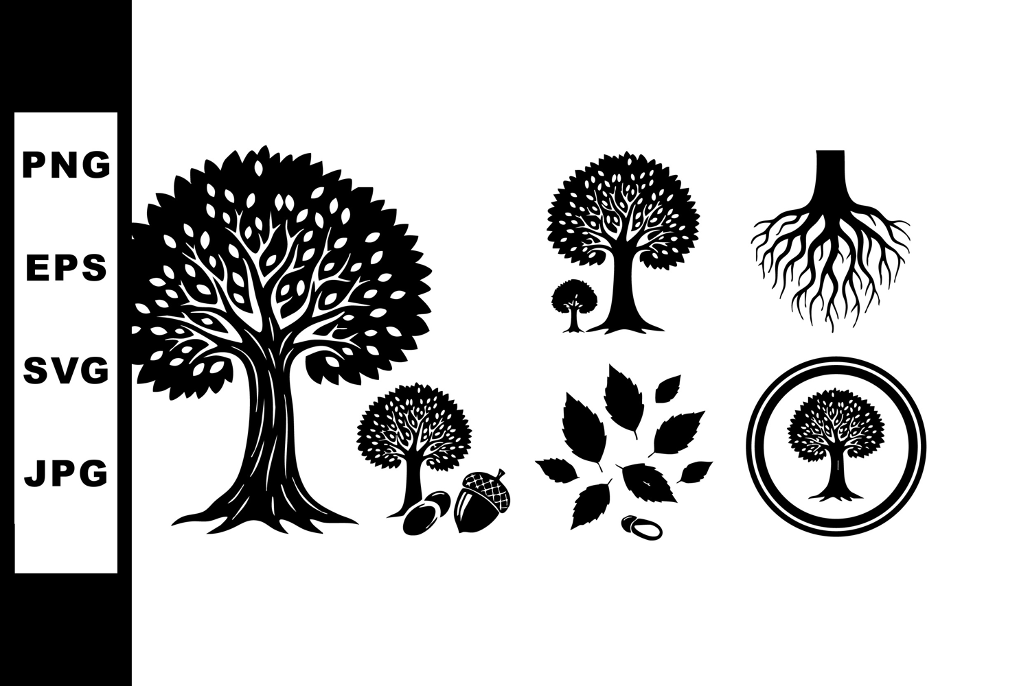 This vector illustration shows black oak tree silhouettes with acorns, leaves, and roots in a clean design style. Calm and natural mood.