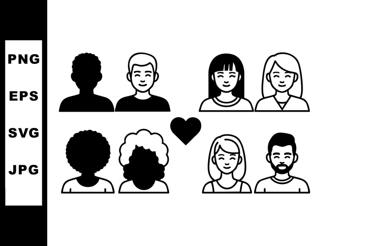 This vector shows diverse couple icons in black and white with a love heart symbol between them, representing unity and affection. Calm mood.