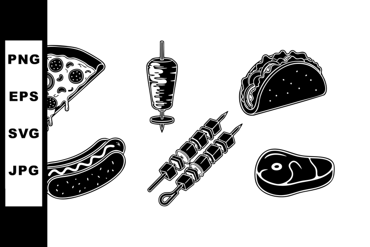 This vector illustration shows diverse fast food items including pizza, taco, hot dog, kebab, and steak in a simple black and white style, casual mood.