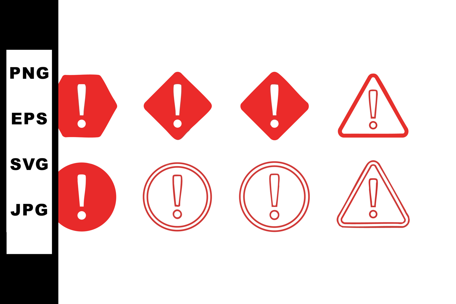 This vector file presents red exclamation mark warning signs in various shapes including circles, triangles, and octagons. It conveys alert and caution messages with clear, bold visuals. Bright and attention-grabbing style.