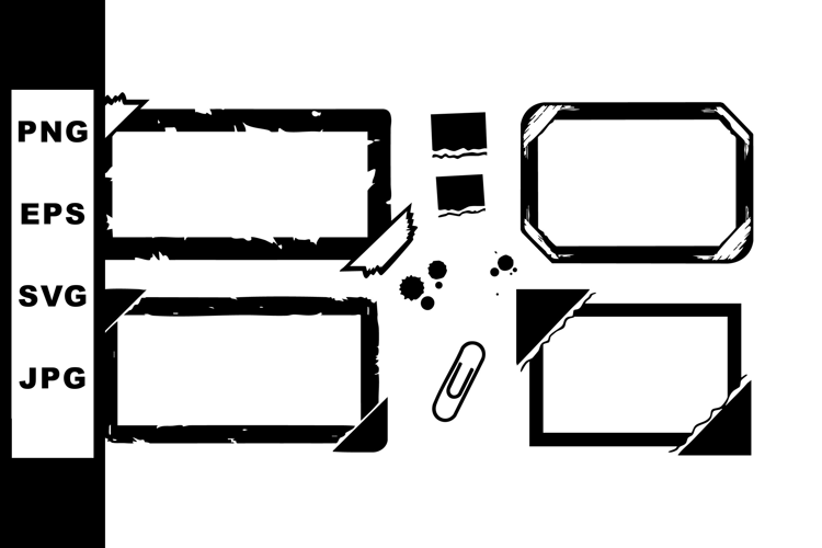 Vector features five black grunge rectangular frames, a paper clip, and ink splatters arranged on white background. The design is simple, artistic, and versatile. Mood is creative.