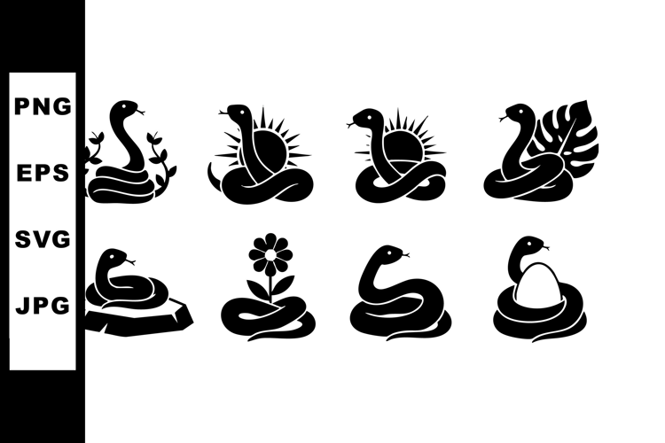 This vector set features black snake silhouettes combined with flowers and tropical leaves, creating a stylish and elegant nature-themed design collection. Calm and artistic.