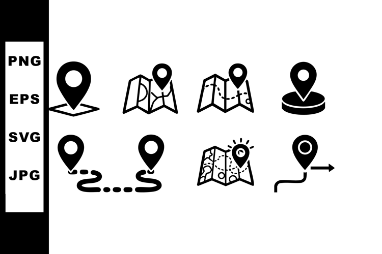 Black location pin icons combined with maps and routes illustrate navigation and direction concepts in a clear, minimalist style. Vector graphics convey guidance and travel mood.