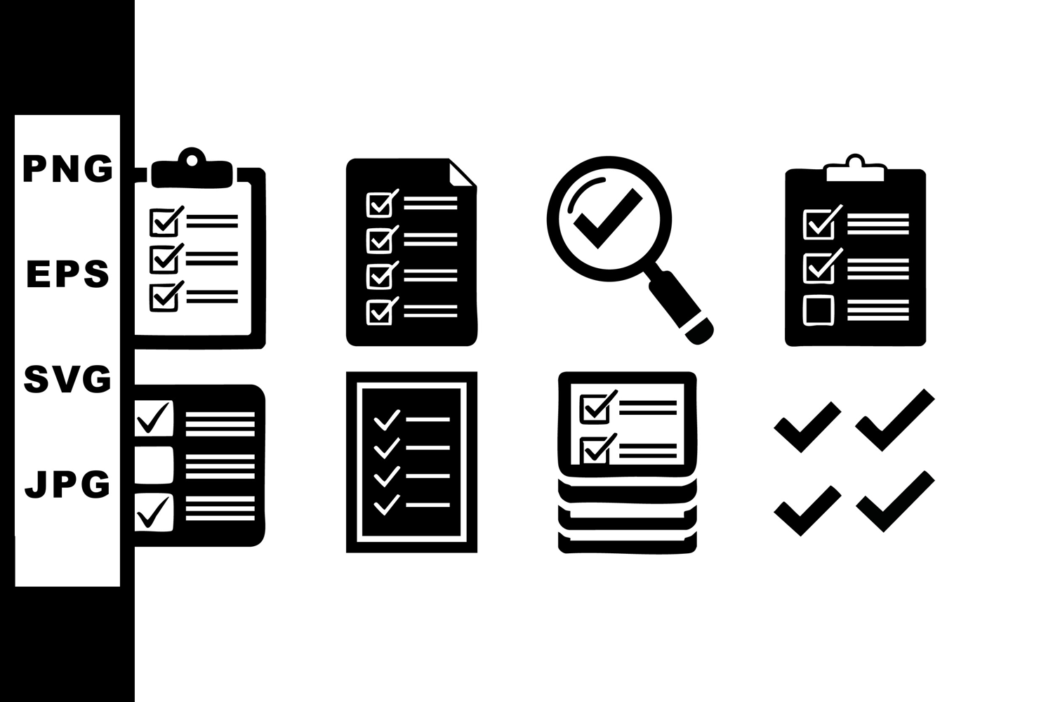 Black and white checklist icons depict task management including clipboards, papers, magnifying glass, and checkmarks in a simple vector style, conveying productivity and order. Clean design, professional mood.