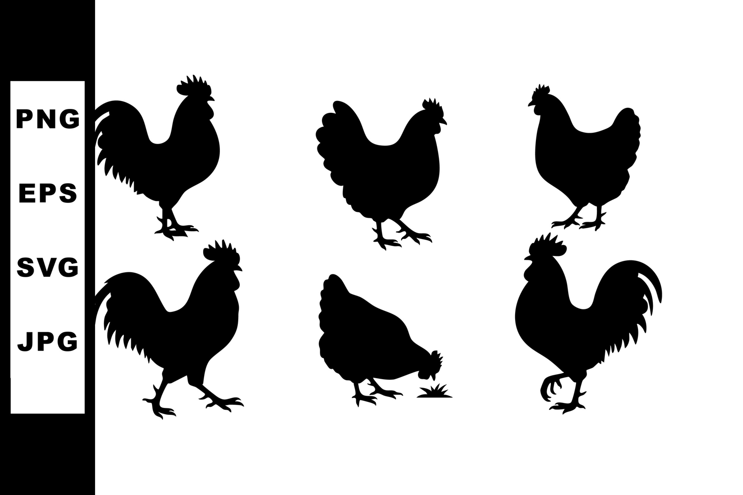 This vector file features black silhouettes of roosters and hens in various poses, ideal for farm or poultry-themed designs. The simple shapes create a rustic, natural mood.