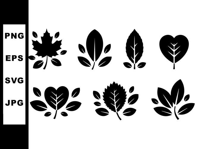 This vector file shows seven distinct black leaf silhouettes with different shapes and details, perfect for nature-inspired designs and creative projects, giving a simple elegant mood.