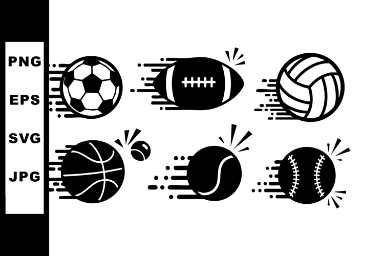 This vector image presents six dynamic sports balls including soccer, football, volleyball, basketball, tennis, and baseball in a motion style, conveying energy and action with a bold black silhouette. Energetic.