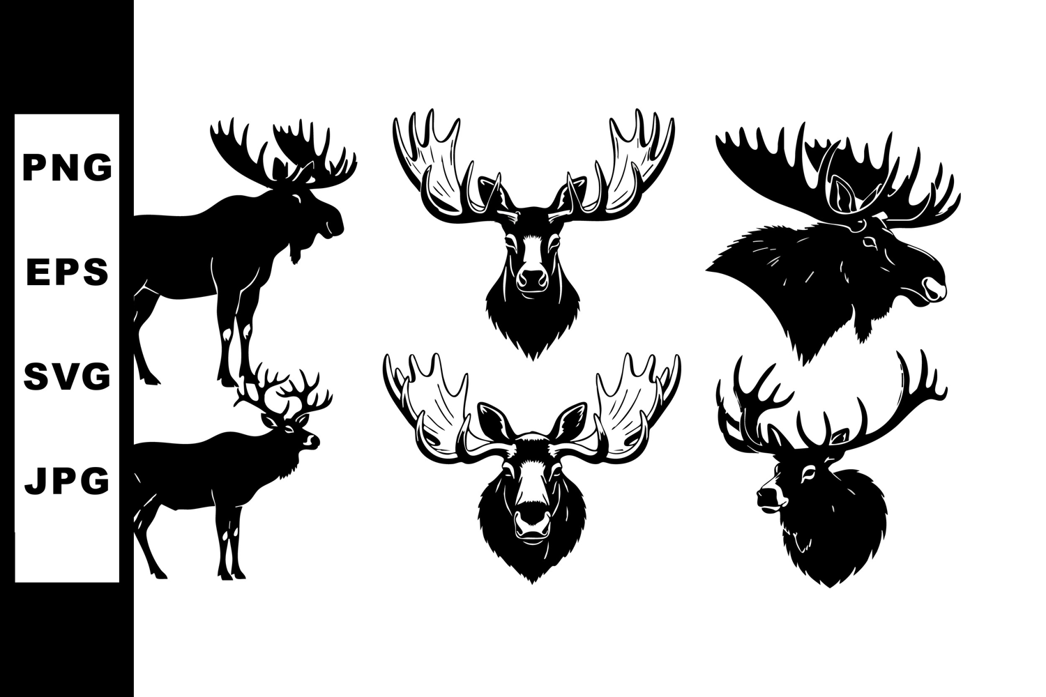 This vector file shows six black moose silhouettes with detailed antlers, perfect for wildlife, nature, and outdoor design projects. The style is bold and natural. Calm and strong mood.