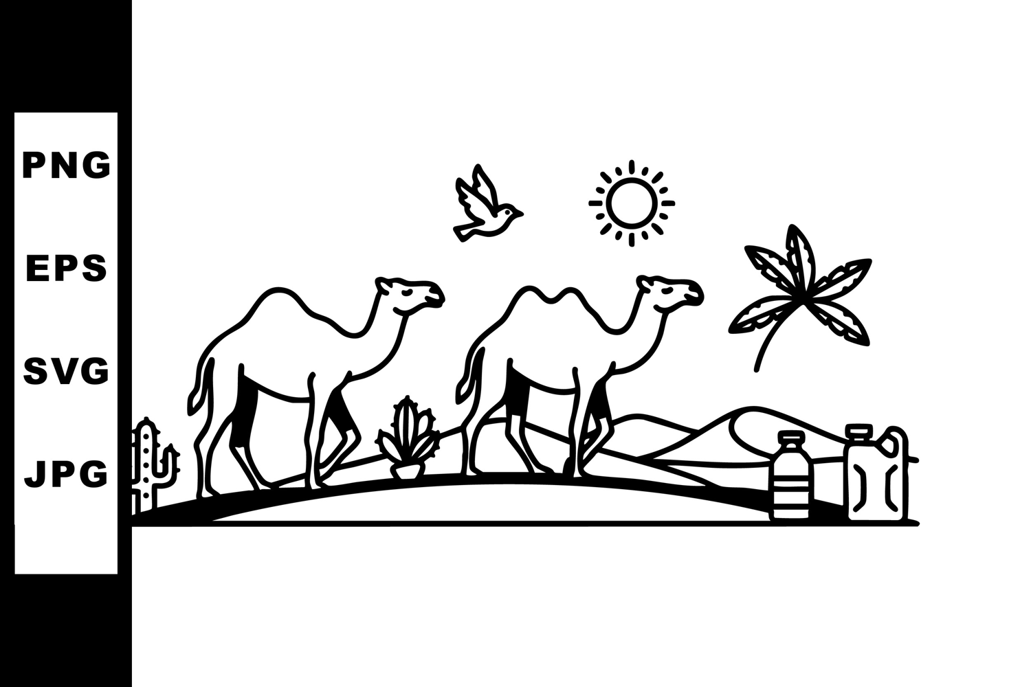 This vector depicts two camels walking across a desert landscape featuring cacti, hills, a sun, and flying birds. The design is simple and monochrome, evoking a calm mood.