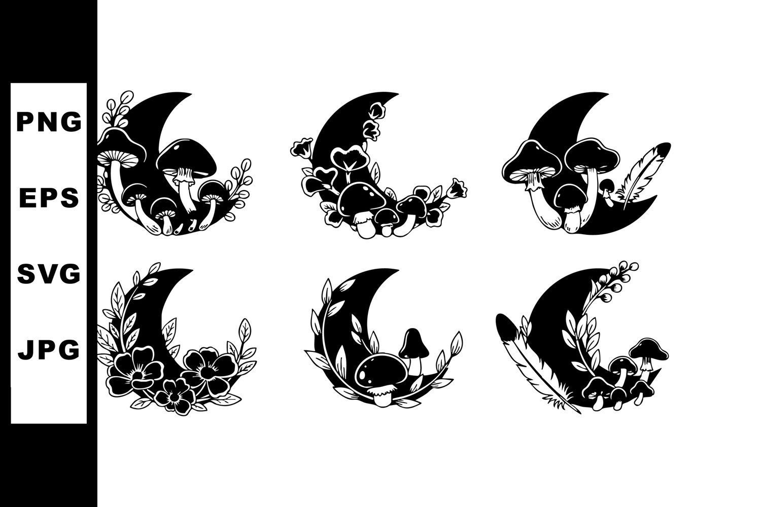 This vector set features six black moon silhouettes decorated with intricate floral elements and feathers, showcasing elegant nature-inspired art in monochrome style. Artistic and graceful.