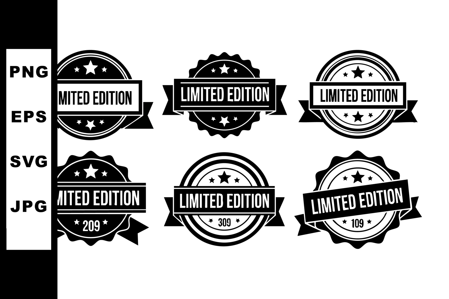 This vector image shows six black and white limited edition badges featuring stars and ribbon banners, ideal for product branding and packaging design. Stylish and professional.