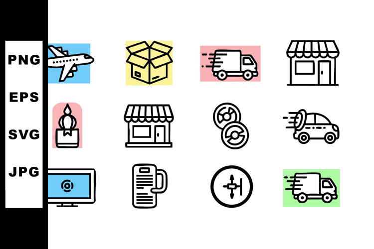 This vector set shows various delivery and shipping icons such as an airplane, trucks, packages, stores, and an electric car, designed with colorful highlights in a clear style. Efficient and modern.