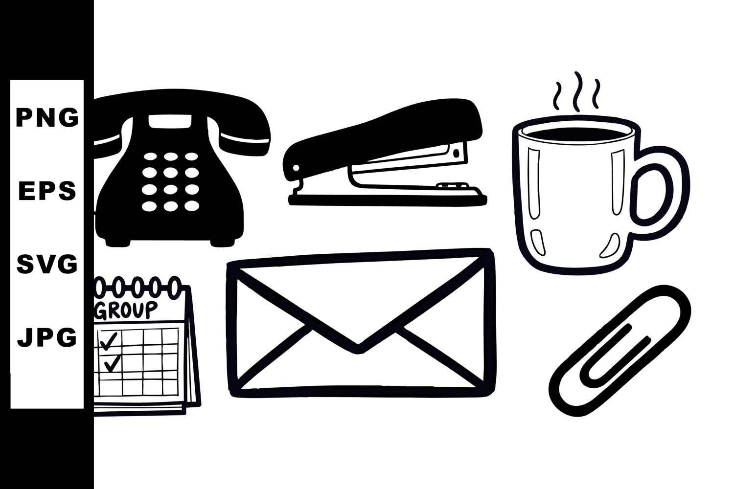 A collection of black and white minimalistic office supplies icons including telephone, stapler, coffee mug, calendar, envelope, and paperclip, simple line art style.