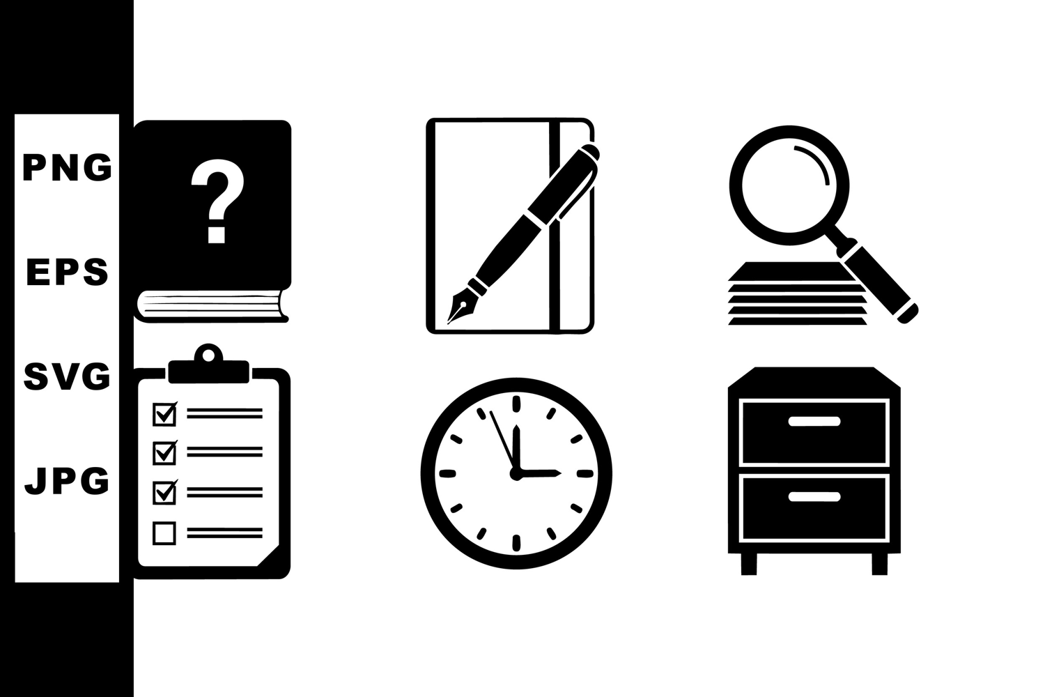 Simple black and white office icons show essential work tools like question book, pen notebook, document magnifier, clipboard checklist, clock, and filing cabinet for professional use
