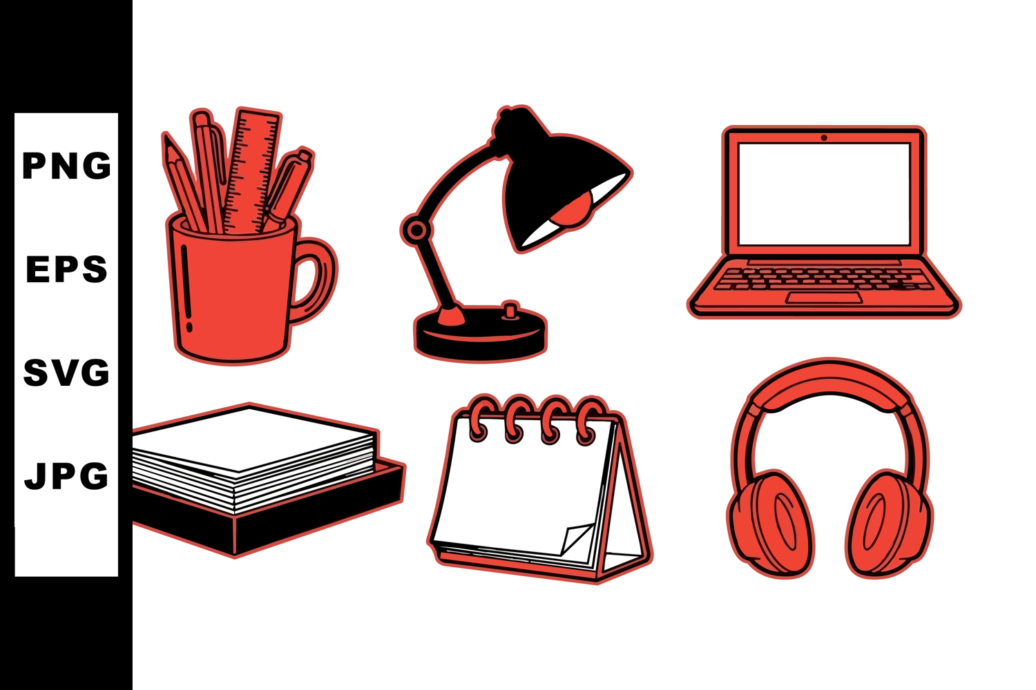 A red and black flat design set displays essential office supplies including pencil holder, desk lamp, laptop, notepad, calendar, and headphones for workspace organization.