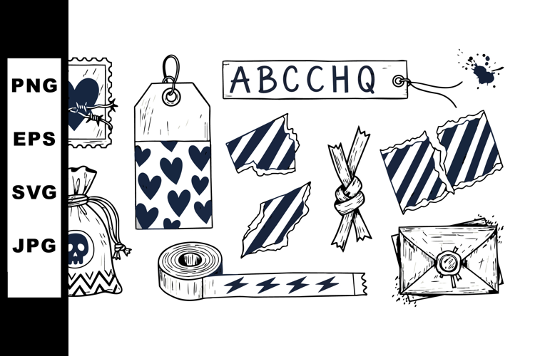 Vintage gothic style black hearts, envelope stamps, ribbon, and tags with hand drawn lines create a decorative and edgy design for scrapbooking or stationery projects.