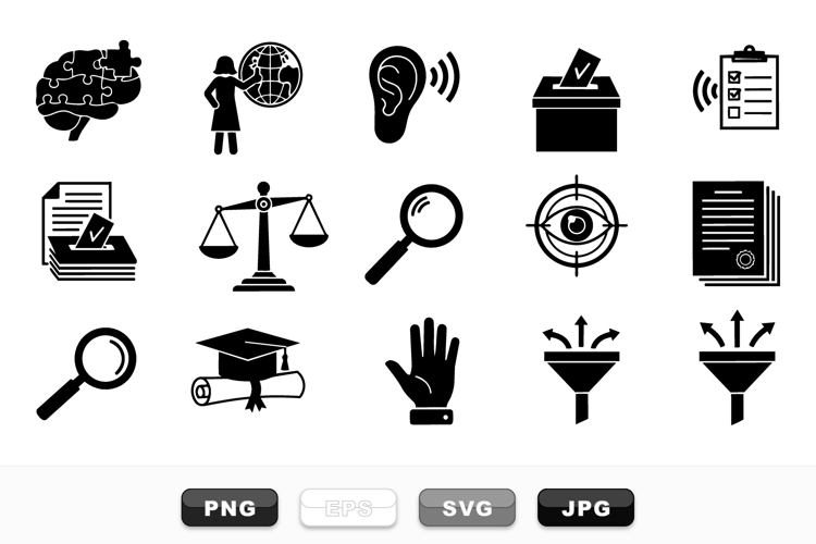 A collection of simple black silhouette icons illustrating education, voting, listening, law, and research elements in minimalist flat style, versatile and clear.
