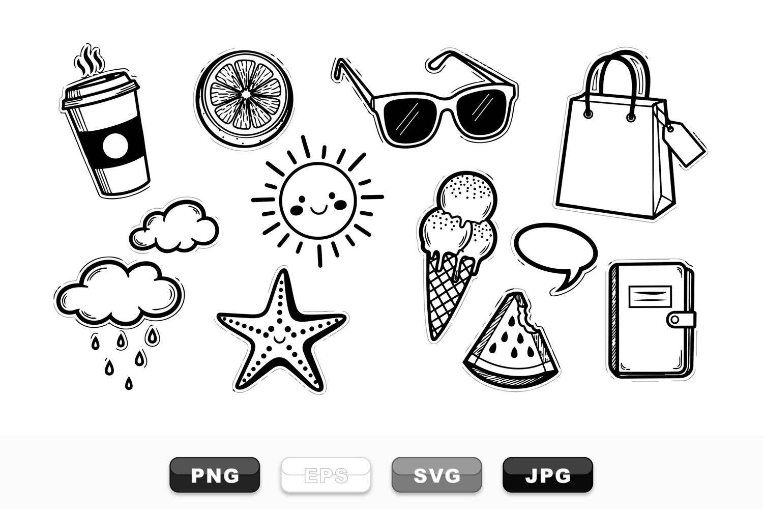 A hand drawn sticker vector collage shows playful summer icons in bold line art, used for stickers, labels, and casual branding.