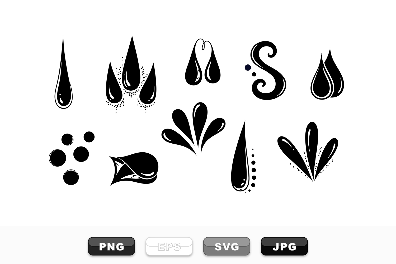 A flat design collection of black droplet and splash icons shown on white background for branding and print uses, bold.
