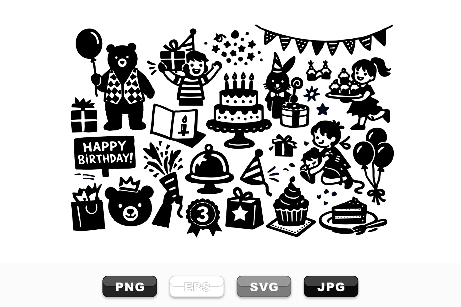 A whimsical kids doodle set depicts birthday cake, balloons, gifts and children in bold black ink, used for party stationery, fun.