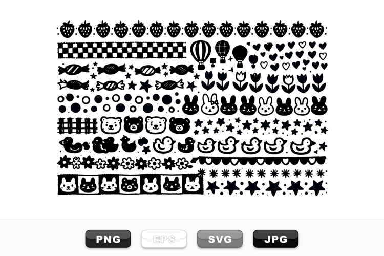 Hand drawn doodle border set shows cute animal faces, sweets, stars and florals, used for childrens packaging and stationery, playful.