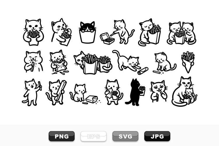 Playful hand drawn line art shows cats snacking on french fries and interacting in icon poses for stickers and childrens prints, whimsical.