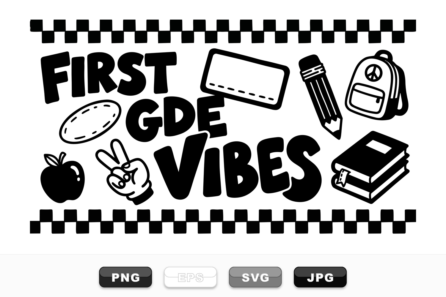Playful doodle lettering reads first grade vibes surrounded by school icons, flat vector sticker style for posters and apparel, cheerful.