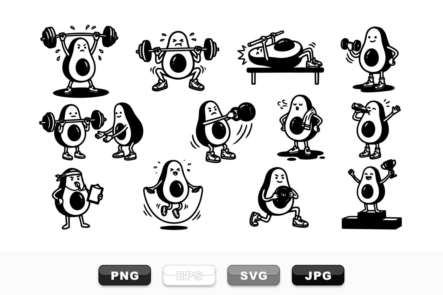 Playful line art series shows avocado mascots exercising and celebrating, useful for fitness branding, stickers, and apparel design, upbeat.