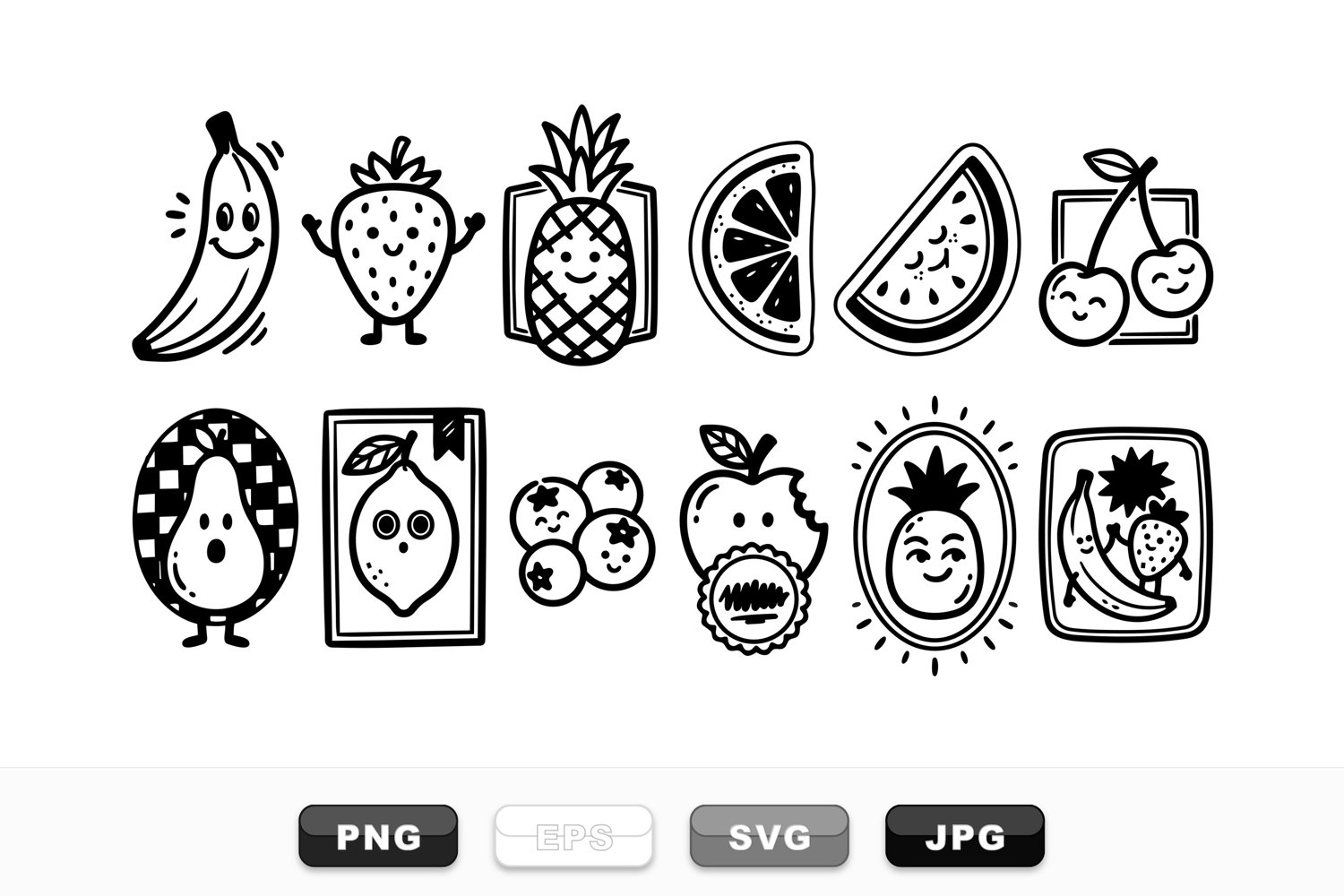 A hand drawn line art sheet displays playful smiling fruit icons in black and white, for stickers, labels, and whimsical branding