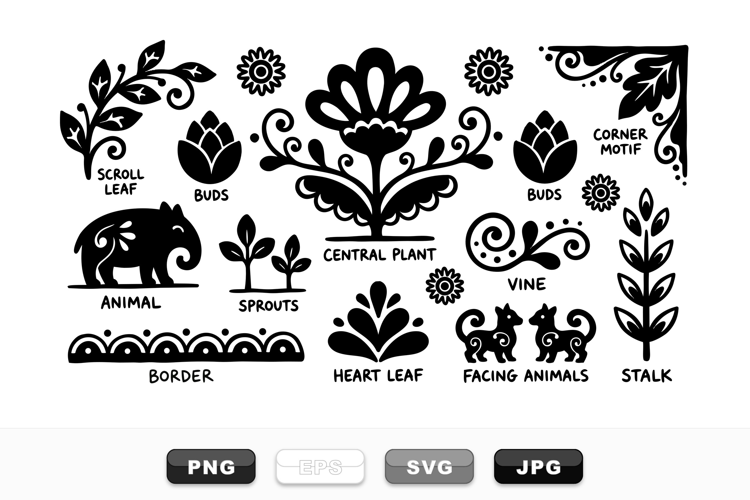 Folk Art Clipart Black Floral Set Folk Animal Silhouettes Decorative Vine Clipart Hand Drawn Buds Folklore Plant Bundle Scandinavian Folk Design Folk Scroll Border Floral Motif Graphics Folk Leaf Illustrations